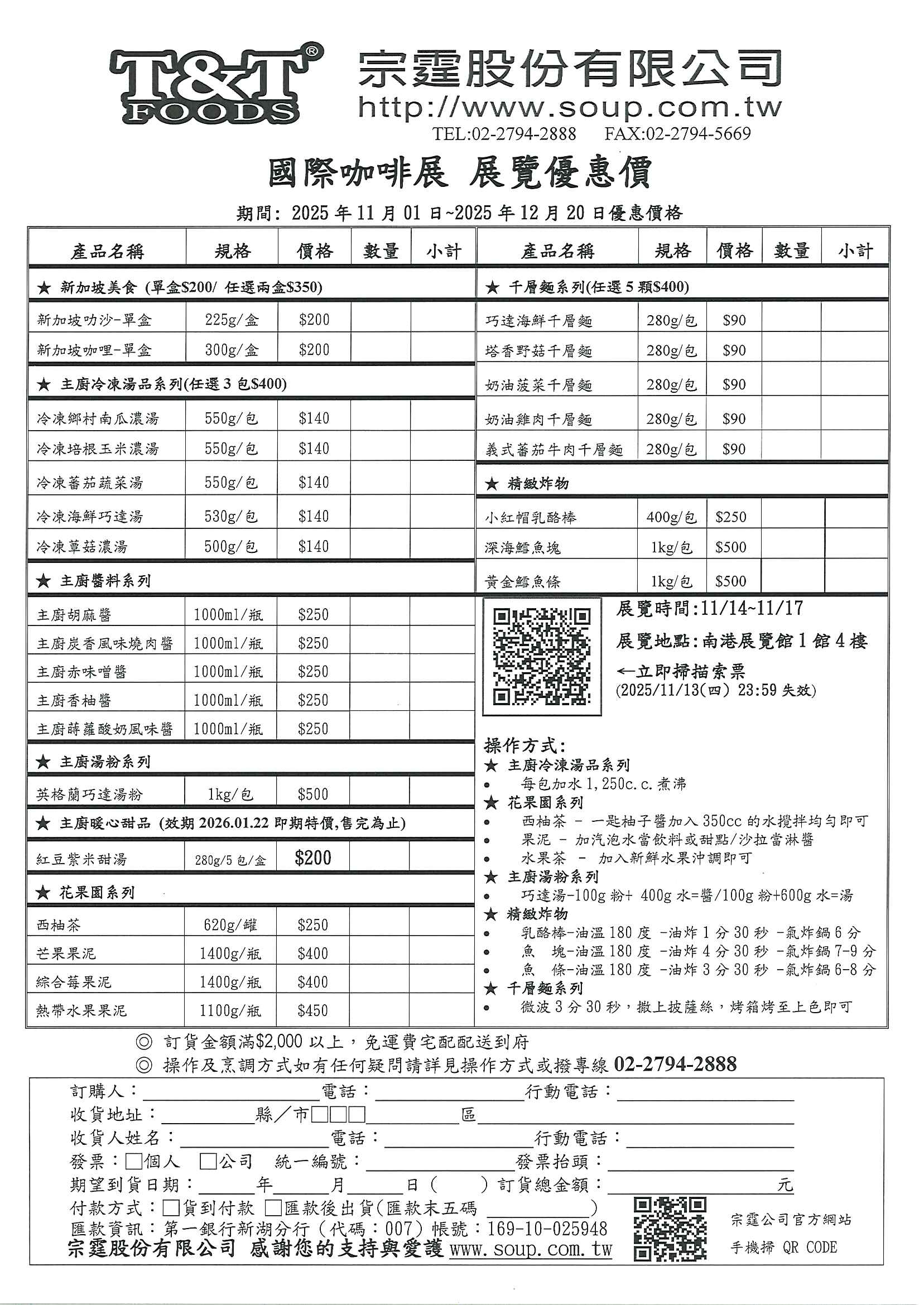 最新消息 首頁 最新消息 活動公告 商品促銷 試吃活動 2025臺灣國際咖啡展*免費門票索取* 2025.10.17 2025國際咖啡展**展覽優惠價** 2025.10.17 2021台灣國際咖啡展 台北南港展覽館 2021.10.08 2020台灣國際咖啡展 台北南港展覽館,敬邀參觀! 2020.10.14 【關於紅豆紫米粥好市多停售】 2020.09.14 7-11母親節預購-酥炸阿拉斯加鱈魚條(500g/包) 2020.03.26 2019台灣國際食品(食材)暨設備展 2019.09.11